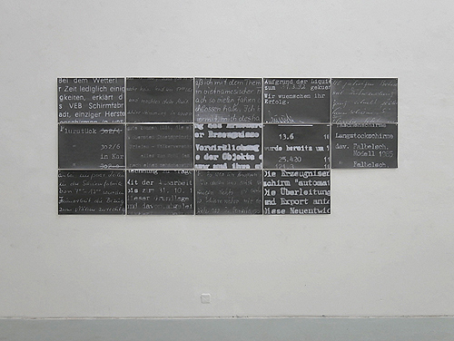 Die 20 Zeichnungen entsprechen einer Fläche von 5m². Das sind 27% des Umfangs von Archivmaterial, welches ich im Staatsarchiv, in Brigadetagebüchern über den VEB Schirmfabrik Karl-Marx-Stadt recherchierte. Die Zeichnungen zeigen Ausschnitte davon. Strich- und zeilenweise verdichte und überlagere ich das Papier mit Bleistift. Die sichtbaren Stellen werden mal mehr, mal weniger modelliert. In der mechanischen Arbeitsweise sehe ich Assoziationen zu verschiedenen Arbeitsgängen in der Produktion. Einem Schema gleich werden Handgriffe wiederholt bis zum gewünschten Ergebnis.